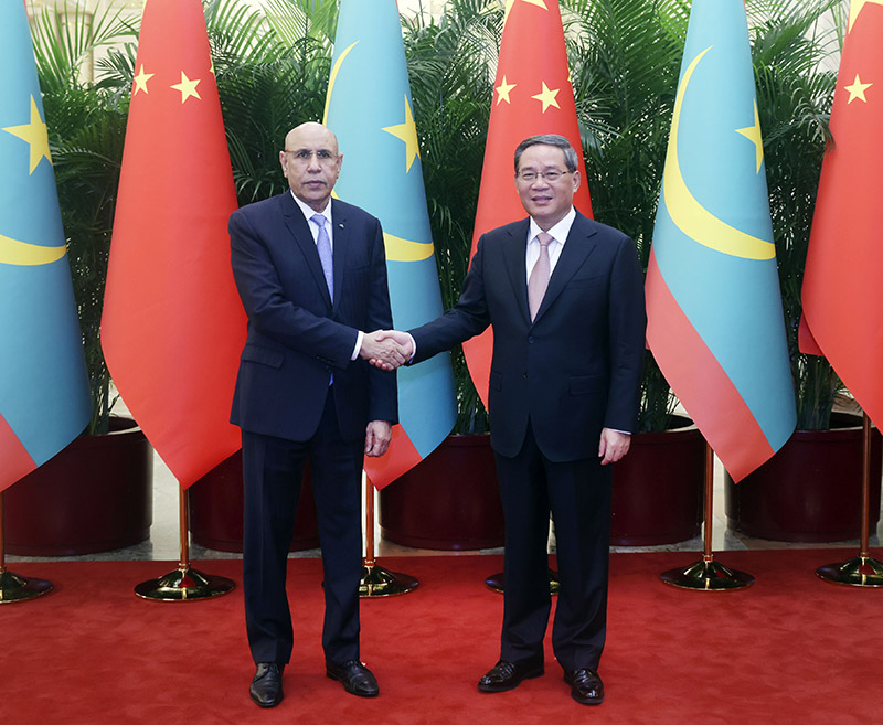 7月30日下午,国务院总理李强在北京人民大会堂会见来华出席第31届世界大学生夏季运动会开幕式并访华的毛里塔尼亚总统加兹瓦尼。新华社记者 刘卫兵 摄