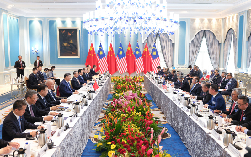 习近平指出,马方将今年东盟的主题定为“包容性和可持续性”,体现了对时局的深刻洞察。中方支持马来西亚发挥东盟轮值主席国作用,愿同地区国家一道,尽早签署中国-东盟自由贸易区升级议定书,以开放包容、团结合作抵制“脱钩断链”、“小院高墙”和滥征关税,以和平、合作、开放、包容的亚洲价值观回应弱肉强食的丛林法则,以亚洲的稳定性和确定性应对世界的不稳定和不确定。